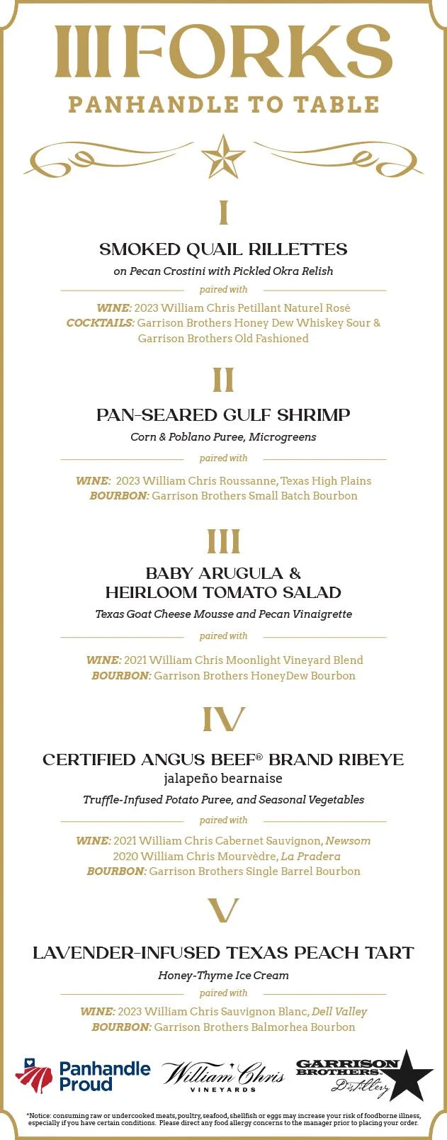 Indulge in Culinary Masterpieces: Enjoy a meticulously crafted menu created by III Forks, paired with Texas wines from William Chris Vineyards and cocktails featuring Garrison Brothers Bourbon.